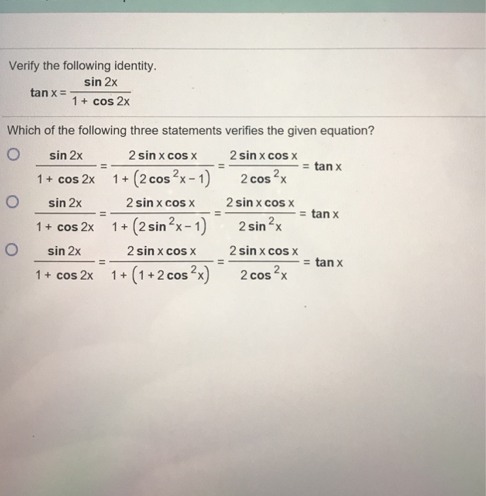 Solved Verify The Following Identity Tan X Sin2x 1 Co Chegg Com