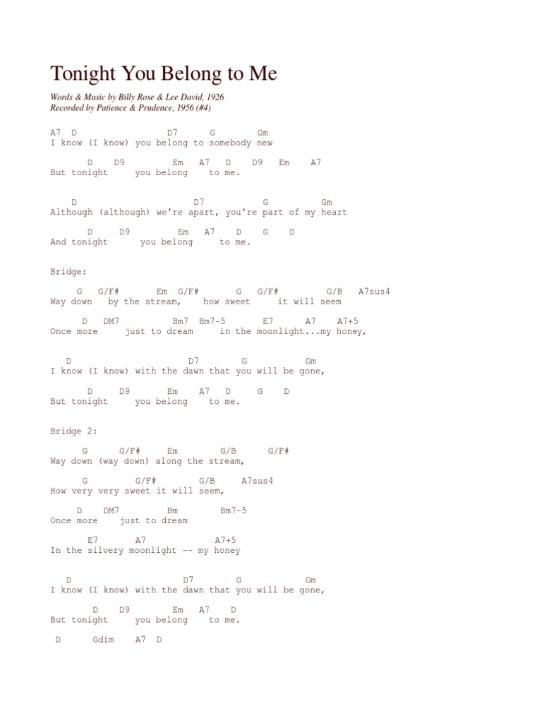 Song Lyrics With Guitar Chords For Tonight You Belong To Me Patience Prudence 1956