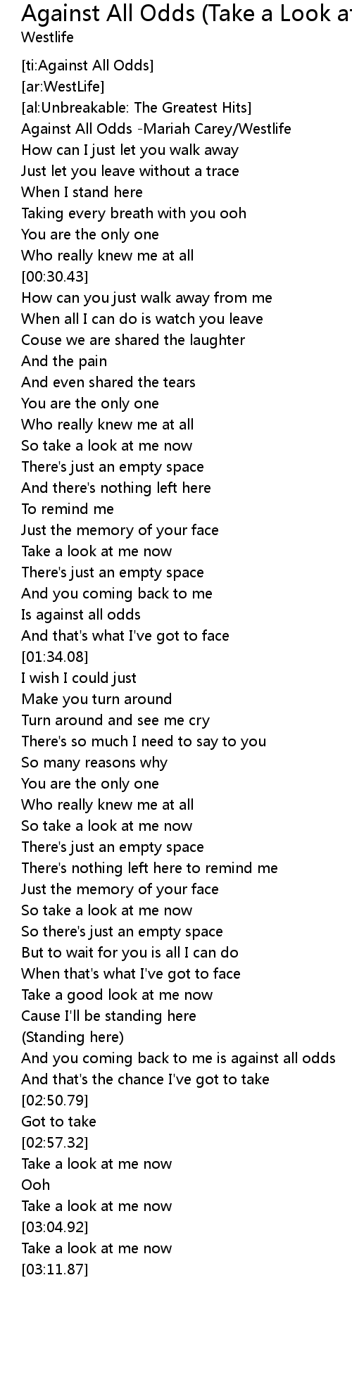 Lyrical Quote From Song Against All Odds Take A Look At Me Now Sung By Mariah Carey And Westlife Music Lyrics Song Lyric Quotes Favorite Lyrics